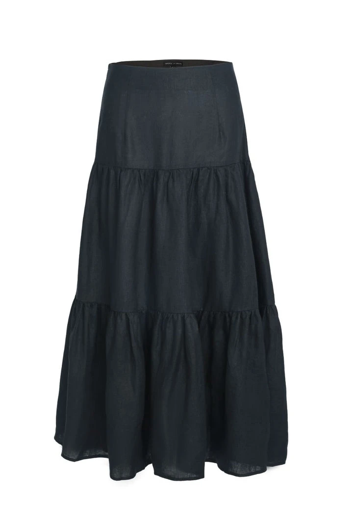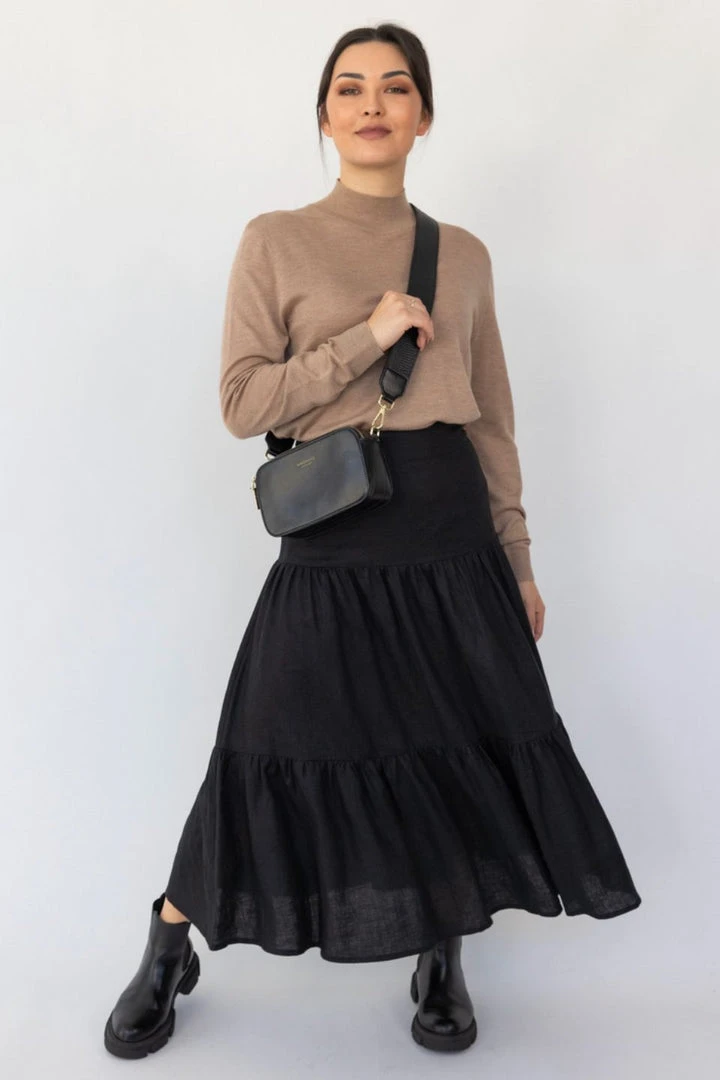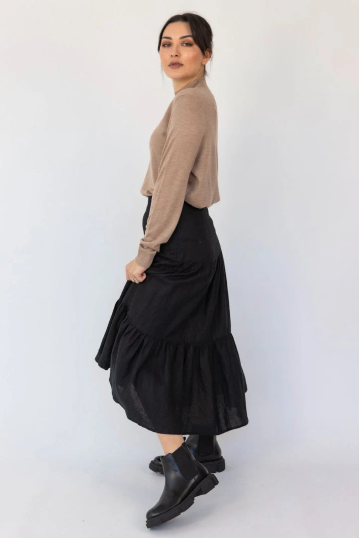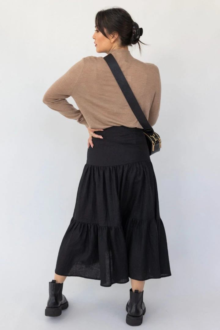 We love the Blazing tiered midi skirt in 100% linen, featuring a flat waist and perfectly balanced tiers for a super flattering fit! For an effortless warm-weather look, wear with a cami and slides. For those cooler days, pair with boots and the Among the Brave Uplifted Ivory Rib Knit Cardigan!