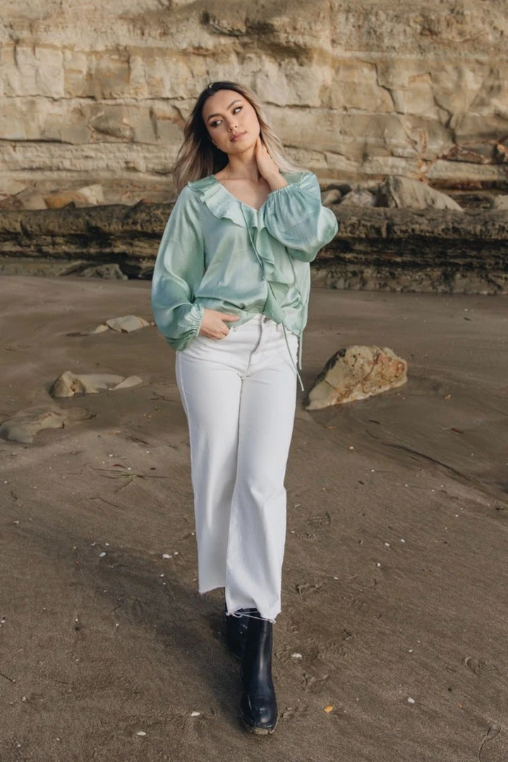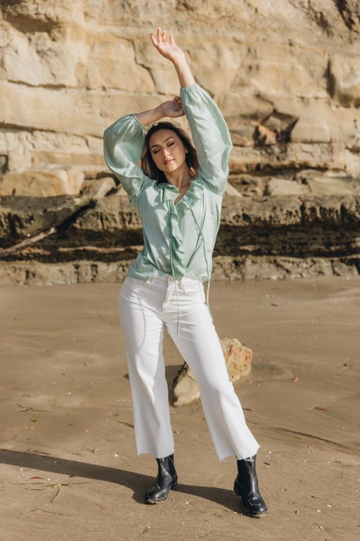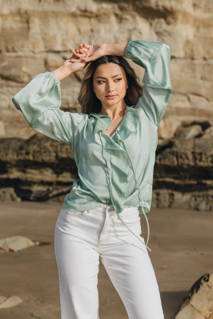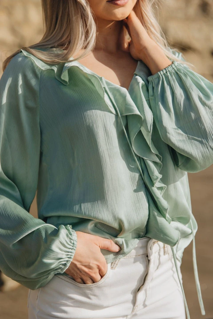 Among The Brave Elena Sage Ruffle Front Tie Neck LS Ruffle Sleeve Top Fashion