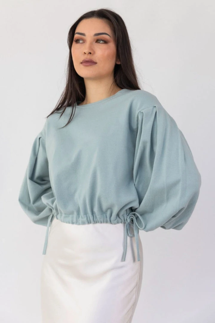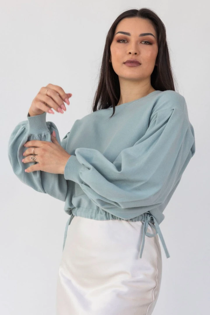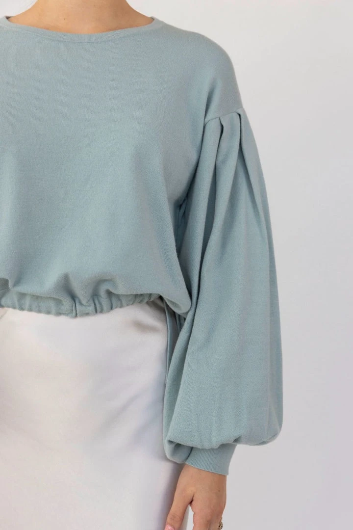Among The Brave Fashion Billie Sea Foam Slouchy Crop Balloon Sleeve Tie Hem Knit