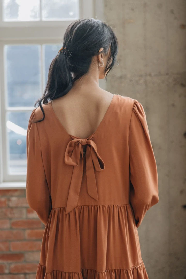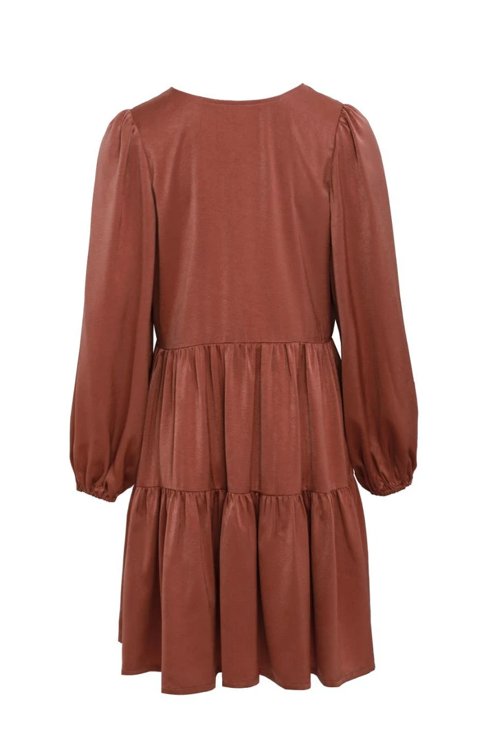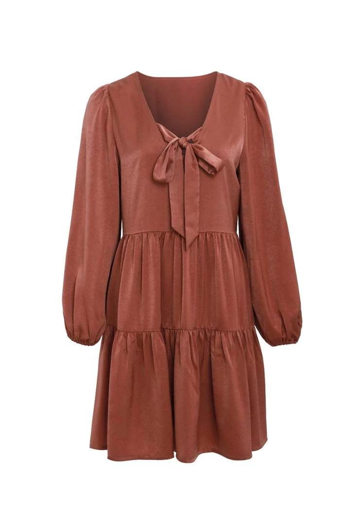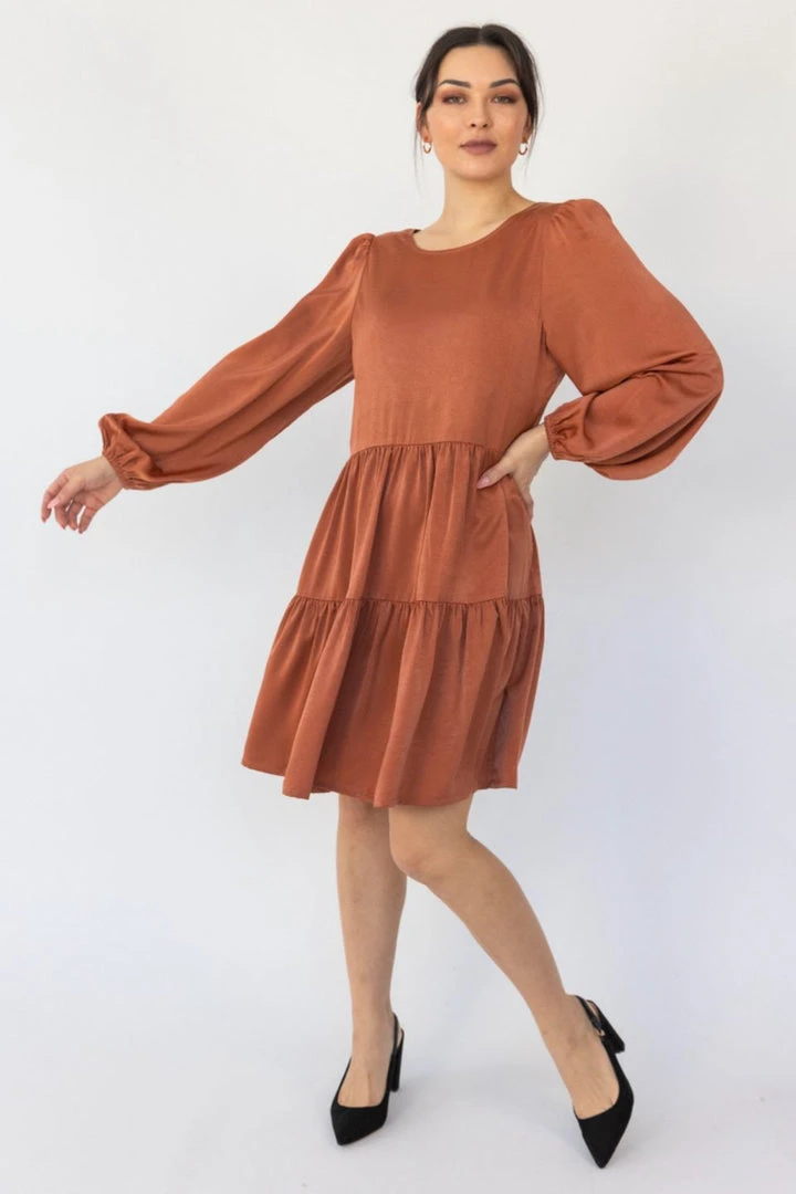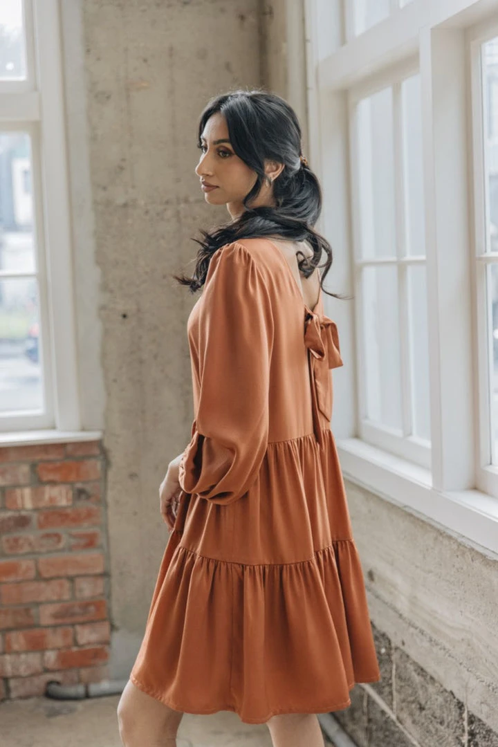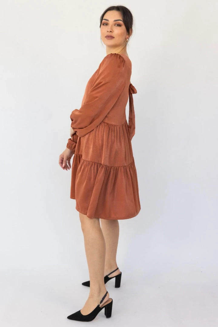 Among The Brave Fashion Deluxe Copper LS Balloon Sleeve Tie Back Tiered Mini Dress