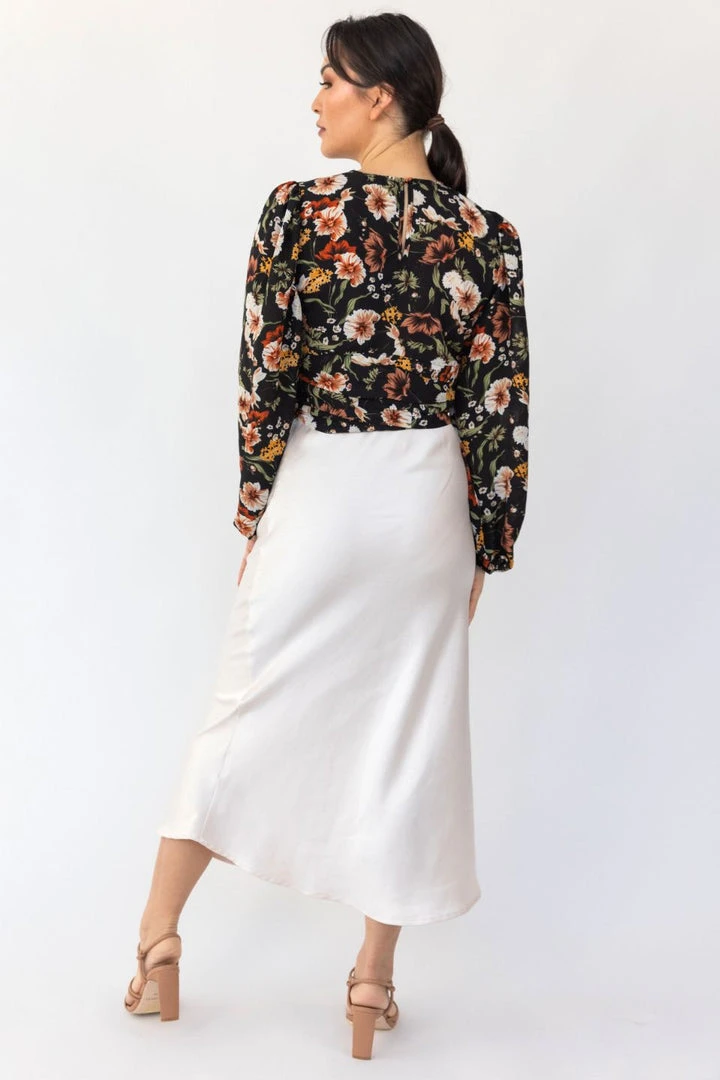 Among The Brave Fashion Reign Large Black Floral LS Balloon Sleeve Plunge Button Front Crop Top