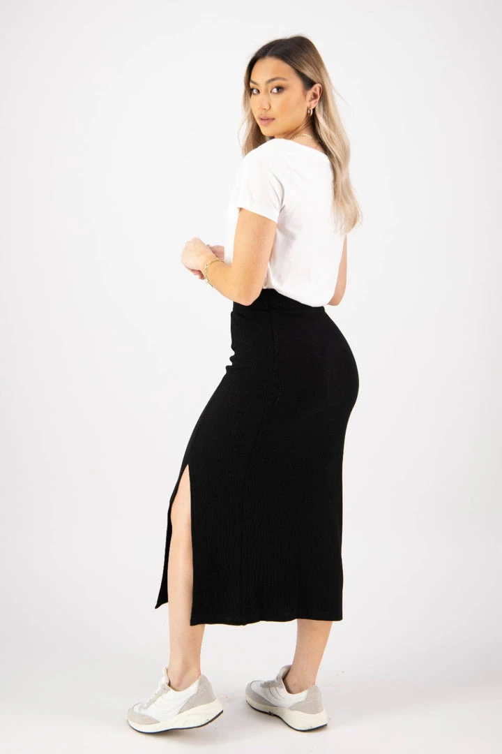 The perfect rib knit midi that you need in your wardrobe. Introducing the True skirt by Among the Brave easily paired with a white tee and sneakers for a chic on the go fit.