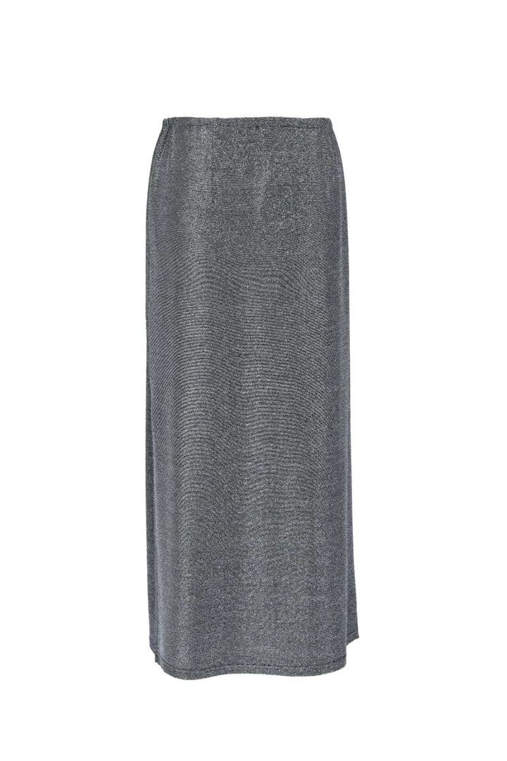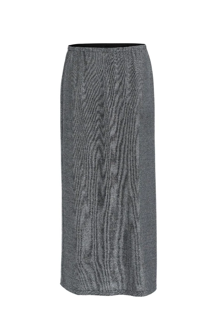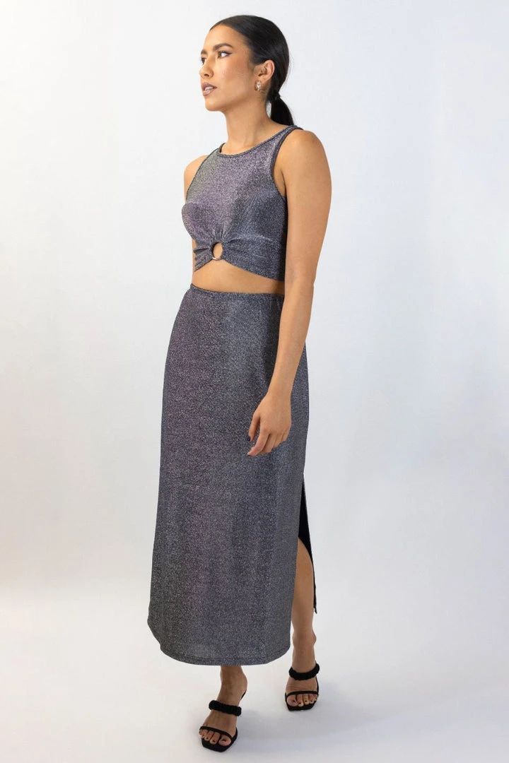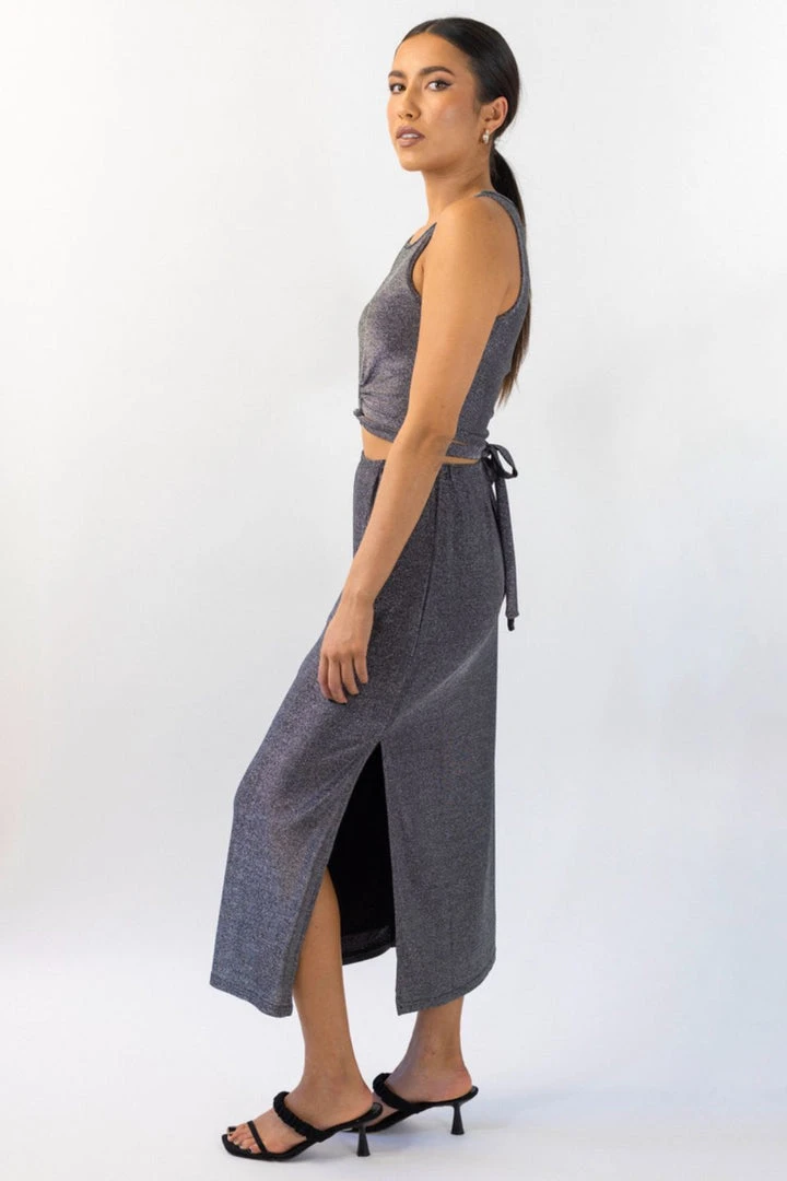 Introducing the Interstellar silver shimmer midi skirt from Among the Brave. This stunning midi skirt features a high side leg split and silver shimmer material. Pair this skirt with the matching Milky Way top for the ultimate night out look.