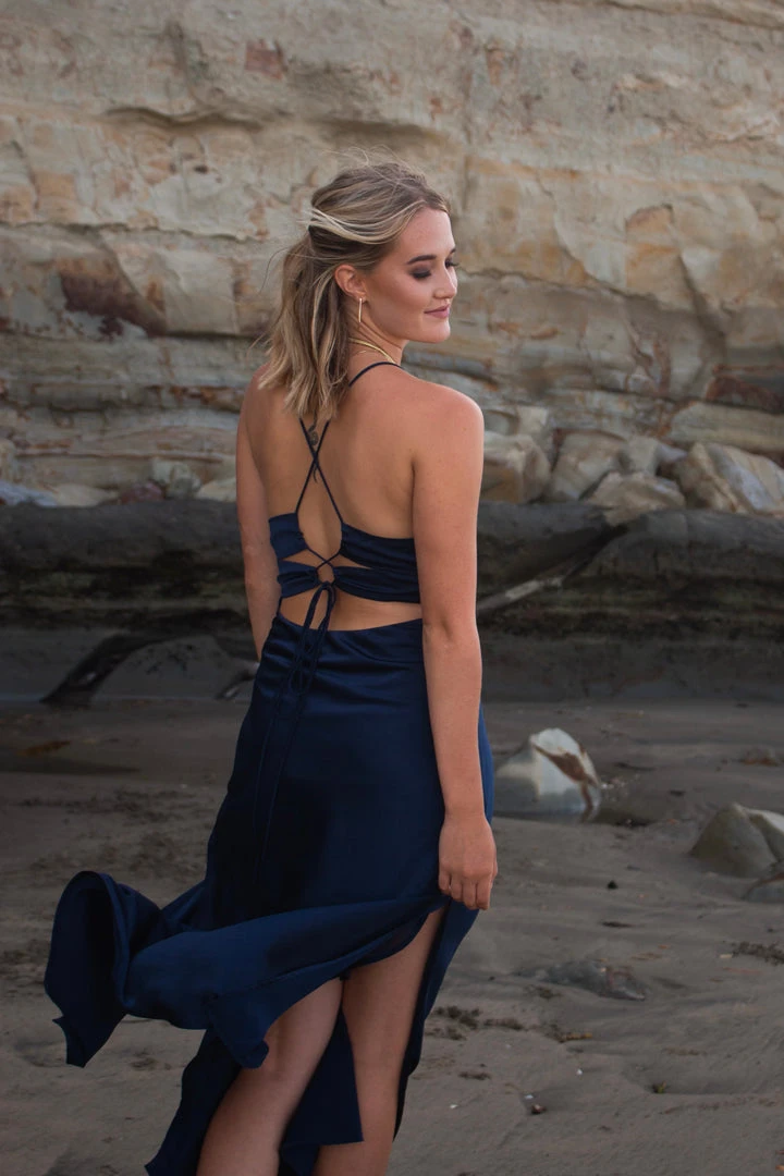 This Navy Satin Midi dress is perfect for all occassions! Dress it down with a sneaker and denim jacket or dress it up with your best jewellery and some heels. You’ll be ready to take on anything! Featuring a cowl neck, leg slit, and beautiful tie back all creating a beautiful silhouette.