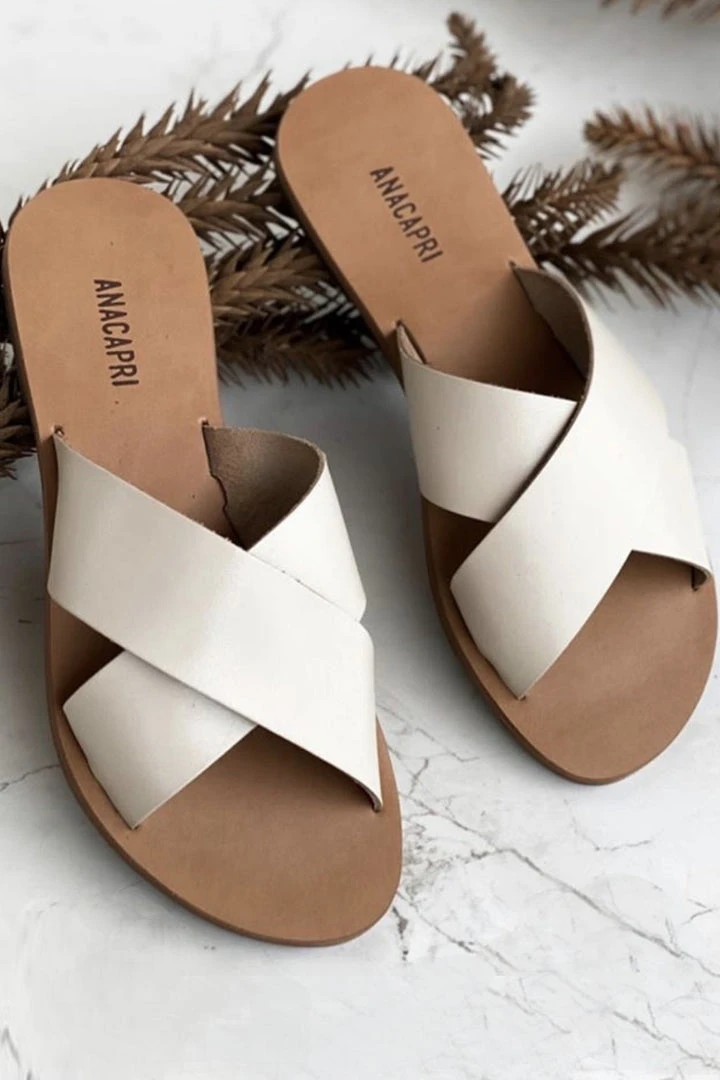 Anacapri – Flat Cross in Bone Slide. These sandals are a hit around the world, these slides are pure in design and elegance and oh so comfy. For those who value simplicity these are fantastic every day shoes.