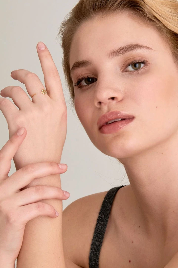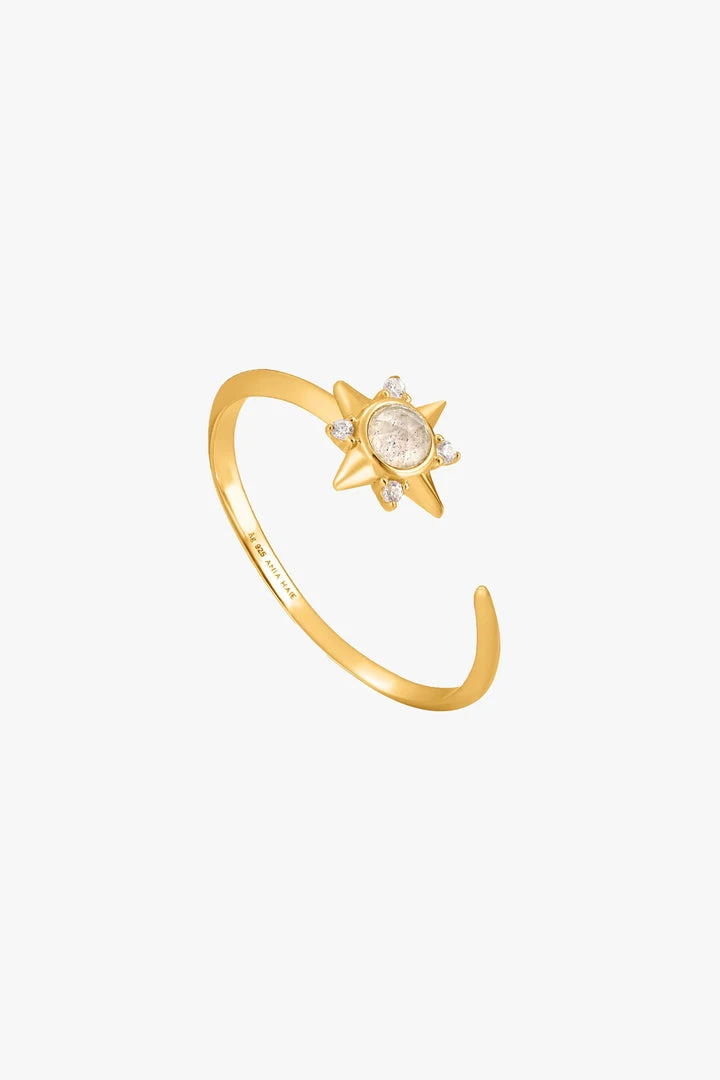 Craft a look that exudes your style with a celestial adjustable ring inspired by the runway. Shine bright with a natural labradorite stone centrepiece and four cubic zirconia star accents. Gently squeeze to adjust the sizing for your perfect fit.Â