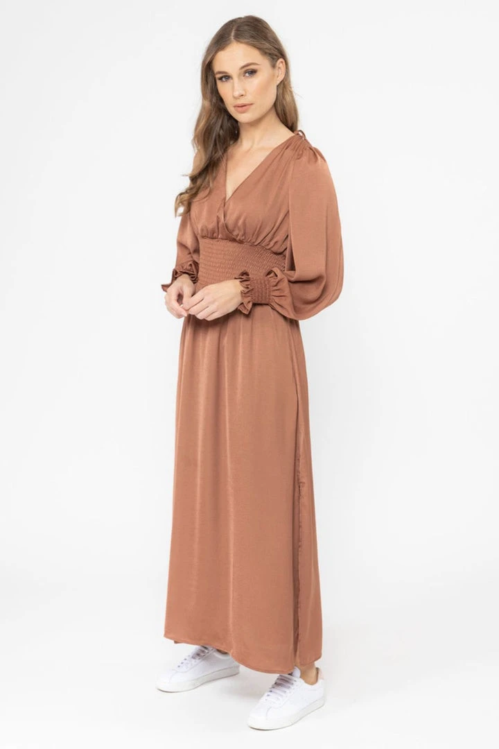 Billie The Label Skilful Rust Satin Shirred Waist LS Maxi Dress