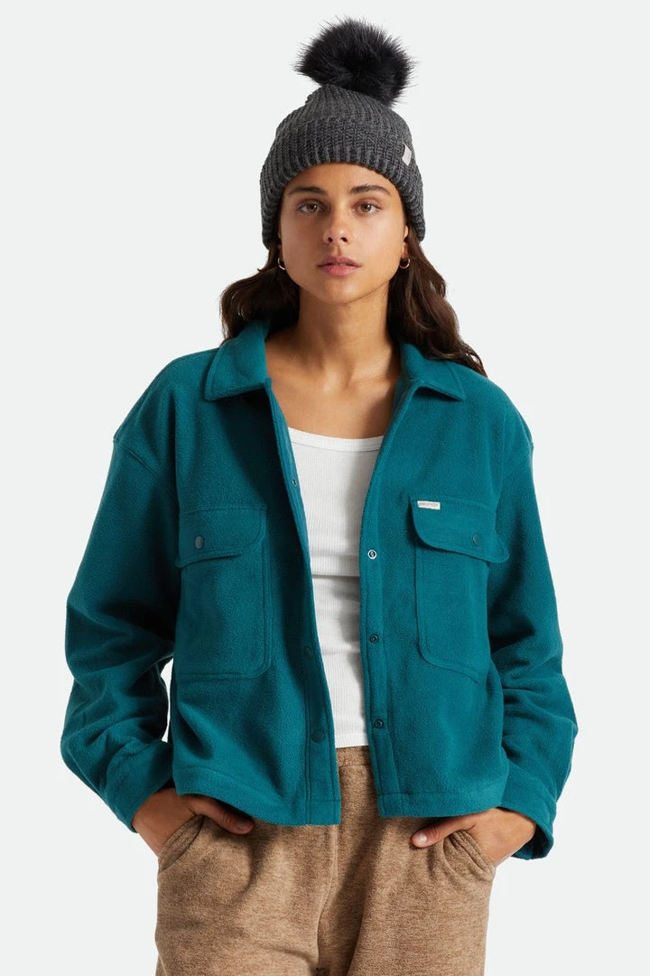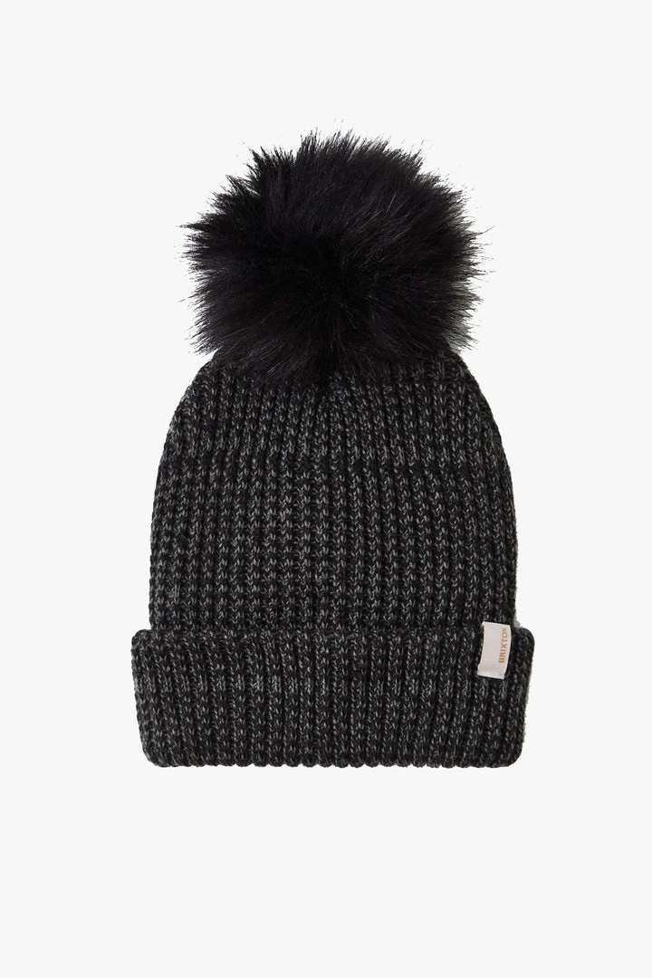 A 100% acrylic 1×1 heavyweight knit beanie with a debossed-leather Brixton label at cuff and faux-fur pom at top of hat.