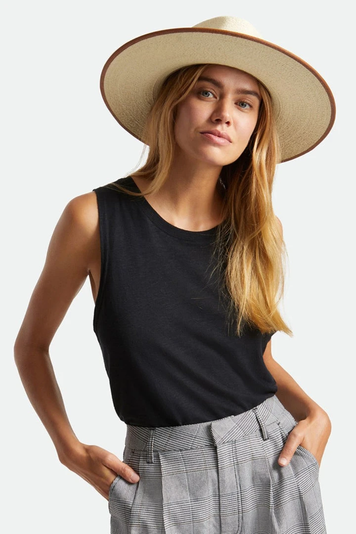 The Jo Straw Rancher Hat is a wide brim, sophisticated straw hat designed with fine Tripilla straw for a high-quality look and feel. Finished with a grosgrain band, brim taping, and metal headwear plaque, this one is great for taking on adventures or dressing up any everyday look.