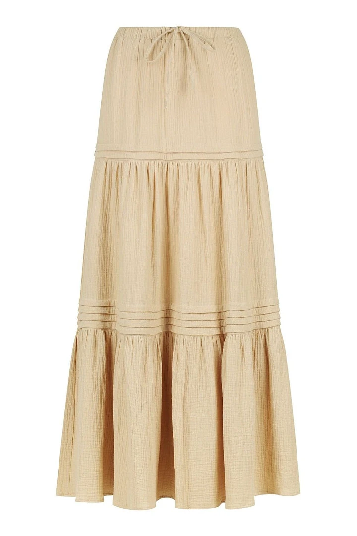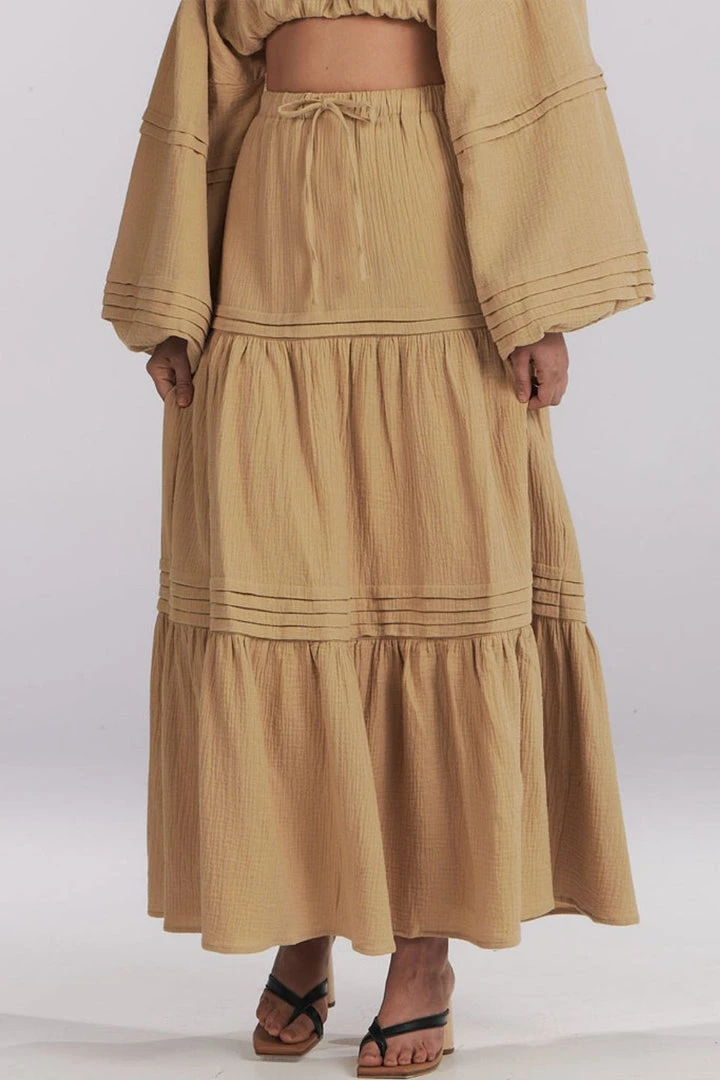 Super flattering and easy to wear, this airy cheesecloth maxi skirt will become a wardrobe staple. With its horizontal pleats and cascading tiers, it’s beautifully boho with the matching Harriet blouson top.