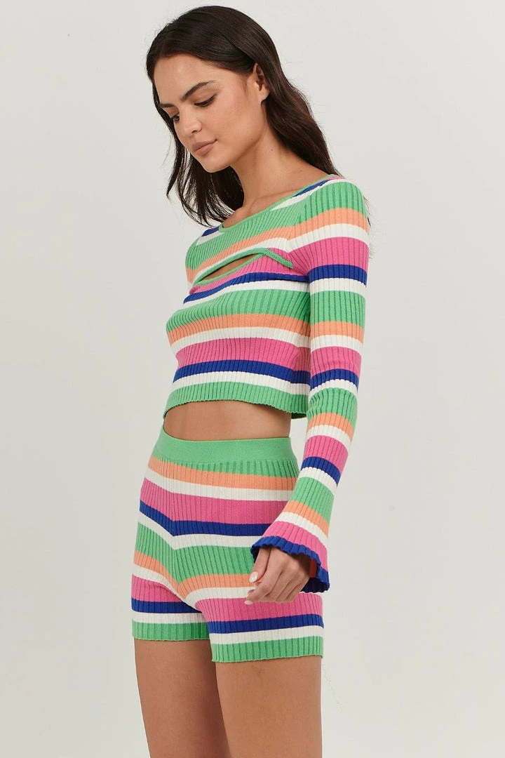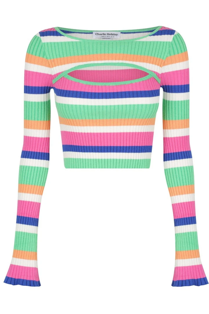A central cut-out feature gives this bell-sleeve top a sexy highlight. Team it with high-waisted flared jeans and platforms for a fun ’70s look.