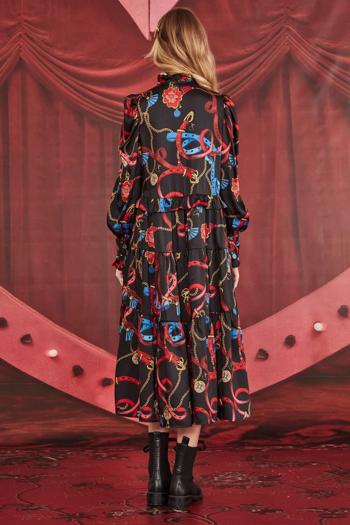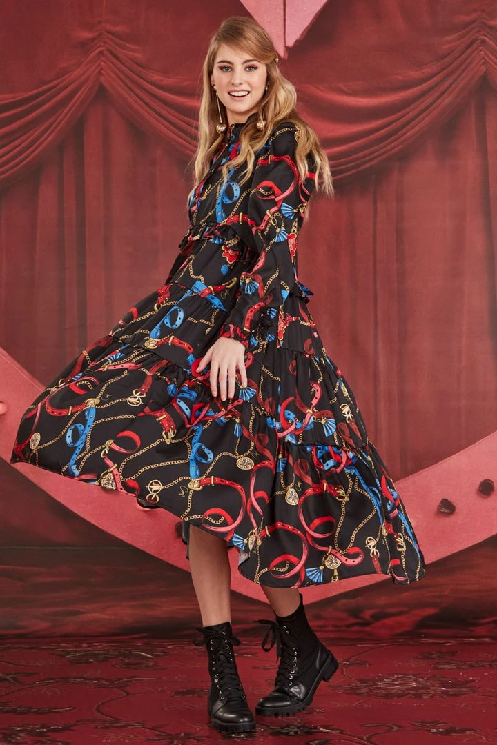 Designed in the ‘Pass The Buckle’ printed recycled polyester twill, this striking new Coop chain print will be sure to turn heads this season. This tiered button through dress features frilled neck detail and and shirred puff sleeves.