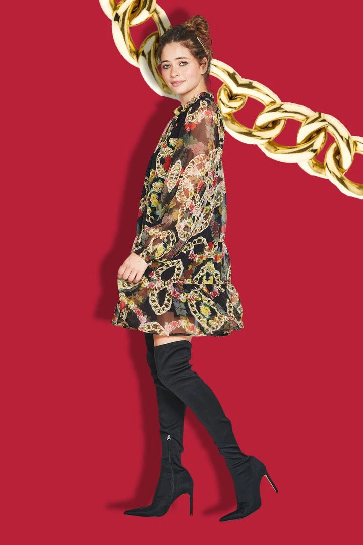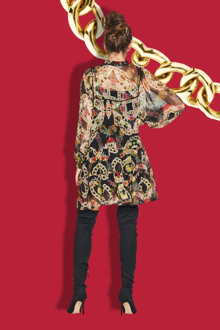 Designed in the playful bold and bright ‘Rope & Glory’ crepe de chine, the ‘Shir Majesty’ features a shirred top with a tie up front and cute tassels. This dress is a super easy throw on for those crisp sunny winter days.