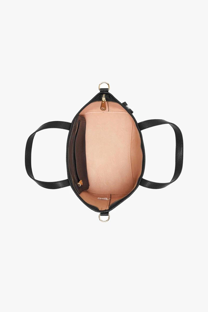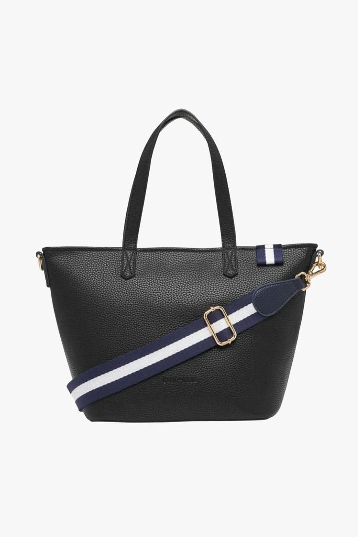 The Elms and King New York Zip Tote is made from premium polyurethane (PU) with nude PU lining and cotton-web detailing. The Tote features top grip handles, an adjustable/removable cotton webbed shoulder strap, an embossed logo, top zip closure, and a hanging zip pocket.