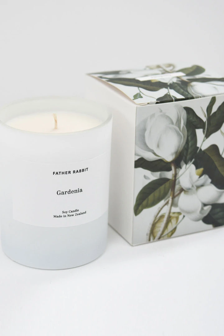 Native to Australasia. Not the easiest flower to grow but the fragrance is stunning, sweet and green. Captured here by Father Rabbit in a beautiful soy candle. Top notes of Peach and Fresh Hay. Middle notes of Gardenia and Jasmine. Base notes of Vanilla, Cyclamen and Lily of the Valley. White glass vessel with beautiful minimal branding.