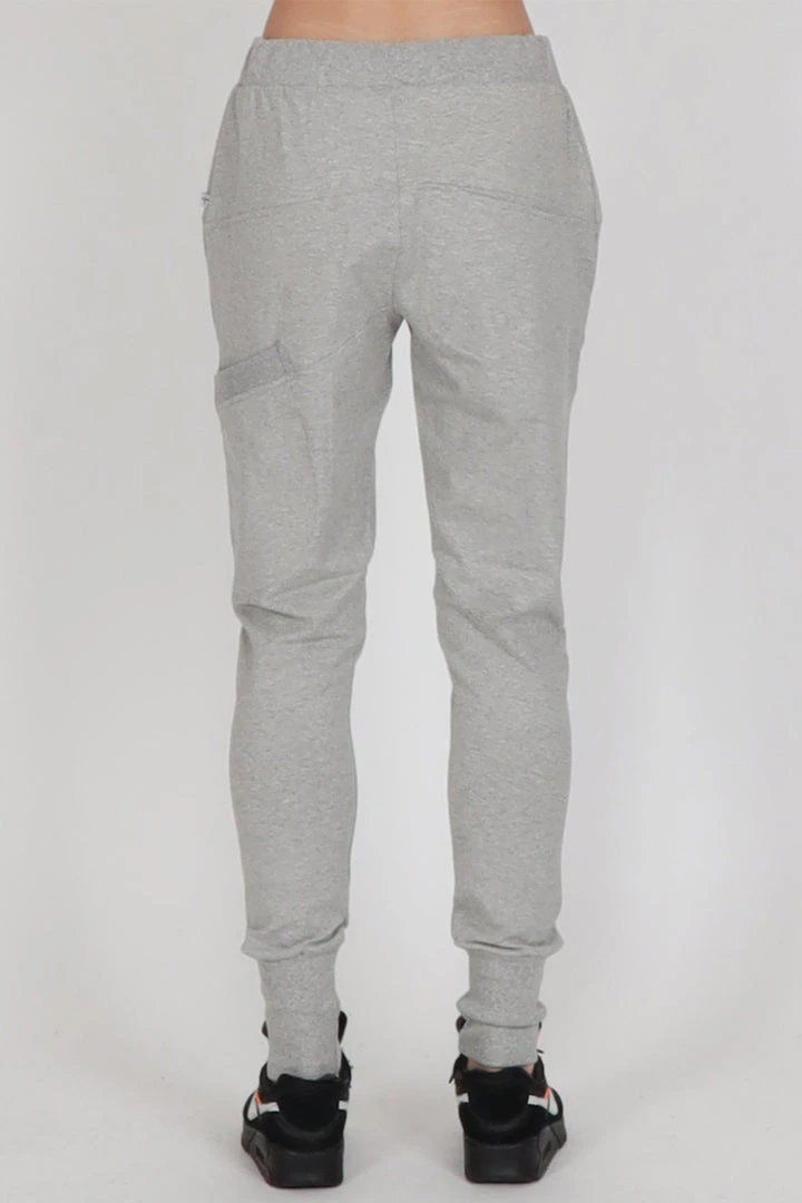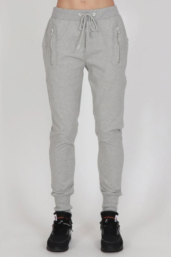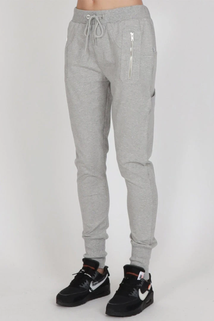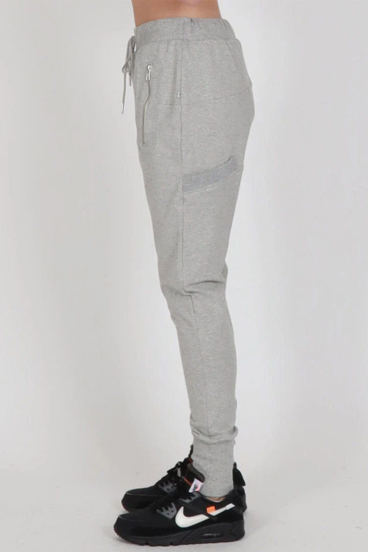 These slim leg drop crotch trackies with silver metal zip pockets on the front and a patch pocket on the left leg. Wide rib cuff, and a ribbed waistband with drawstring.