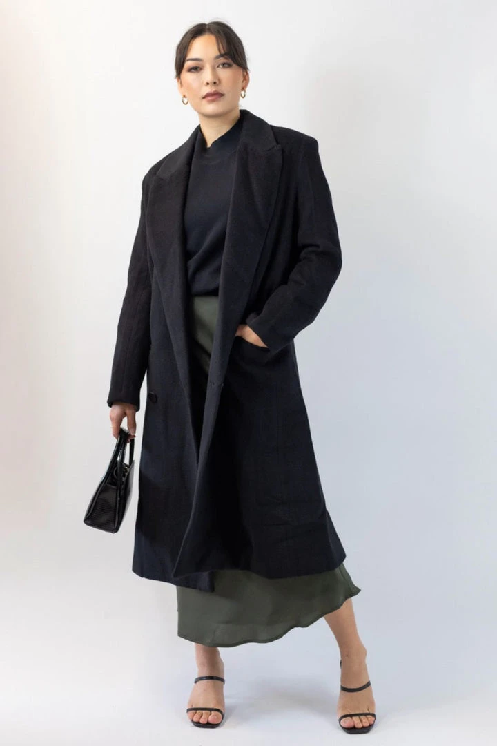 The Sliced Trench has low buttoning detail at the front and double jet pockets. On the sleeves it has invisible zips that can unzipped for a split up to 20cm. The back has two splits. Â