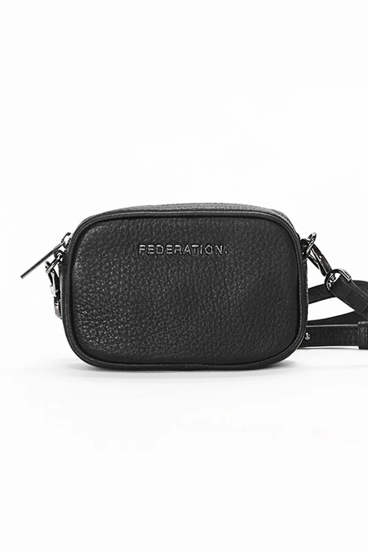 The Small Times bag in black bubble from Federation is the perfect crossbody bag for day to night. With an adjustable crossbody strap which can be removed to use the bag as a clutch.