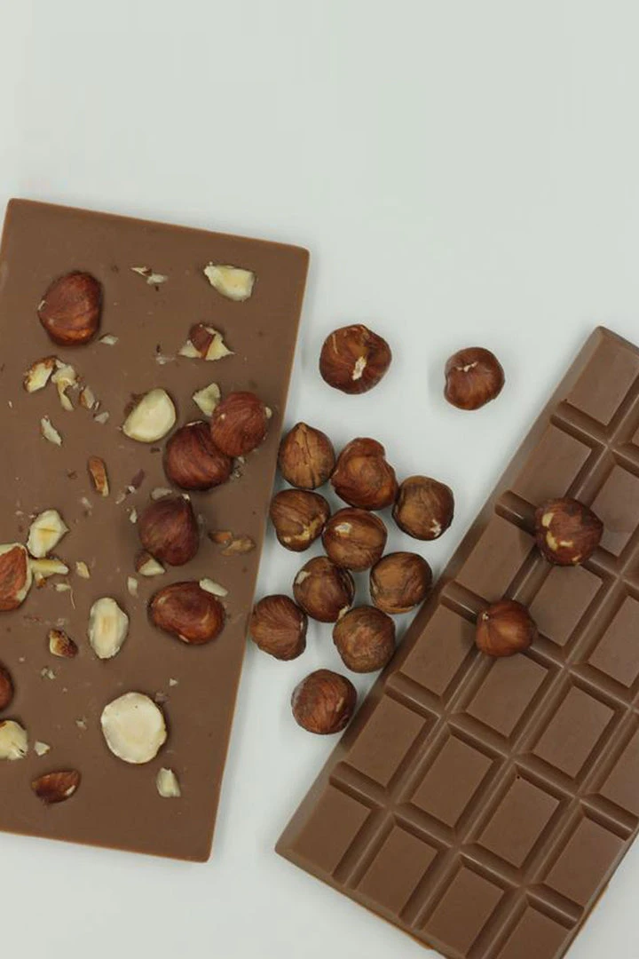 A chocolate bar made of fine Belgium couverture. Classic combination: Sweet chocolate and nuts.