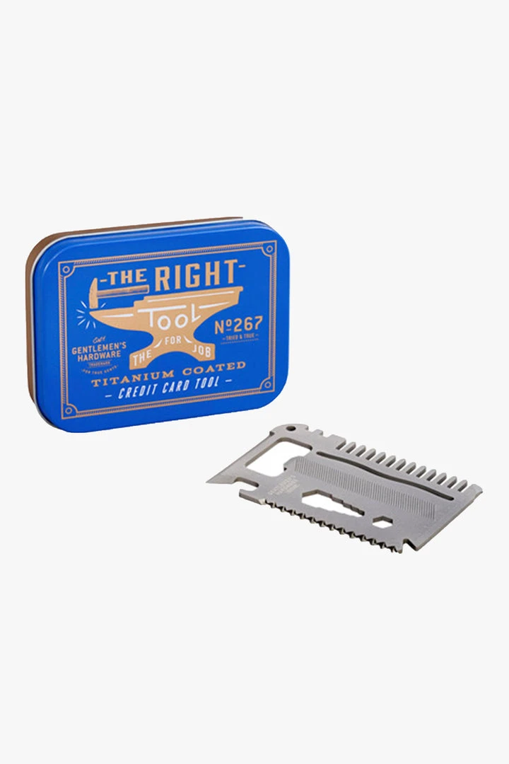 A titanium Credit card tool with 16 uses including bottle opener, spoke key and phone stand.