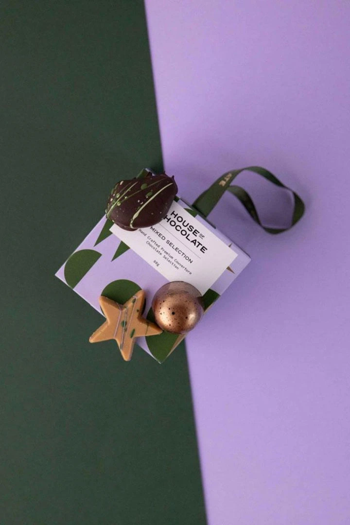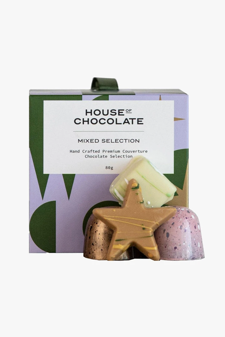 The perfect little House of Chocolate sampler! 80g chocolatiers mix with a surprise selection from the following: salted caramel, pineapple & coconut, solid chocolate, blackcurrant, coffee, baileys, almond praline, fruit fruit, creme de menthe, butterscotch whiskey, hazelnut, freeze dried strawberry, freeze dried feijoa.