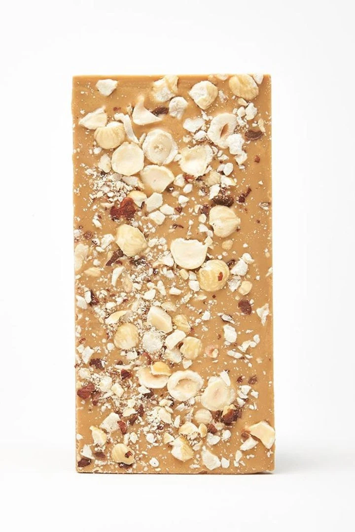 30% cacao premium caramelised white chocolate recognised worldwide for its real milky caramel flavour and mesmerising salty notes. Topped with crushed New Zealand dry roasted hazelnuts.Â