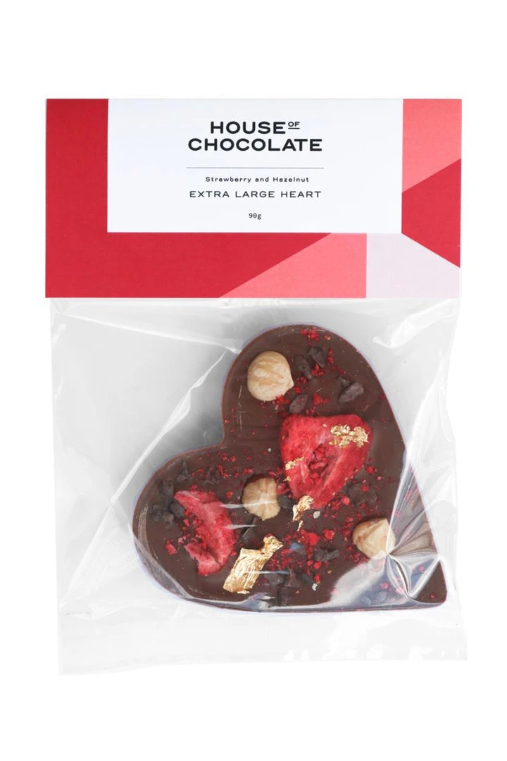 Share the love! Extra-large 90g Milk Chocolate heart topped with New Zealand Freeze-dried strawberries and Hazelnuts. Finished with cacao nibs and edible gold leaf. Gluten-free ingredients.