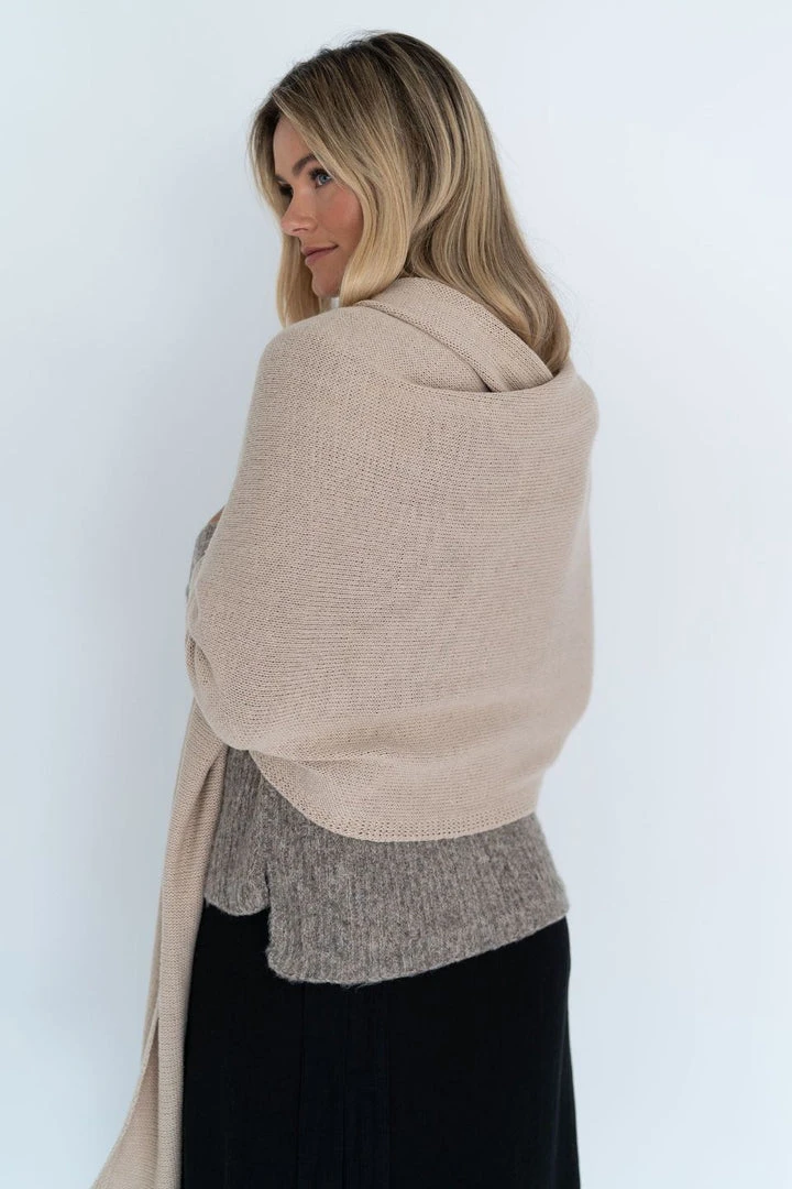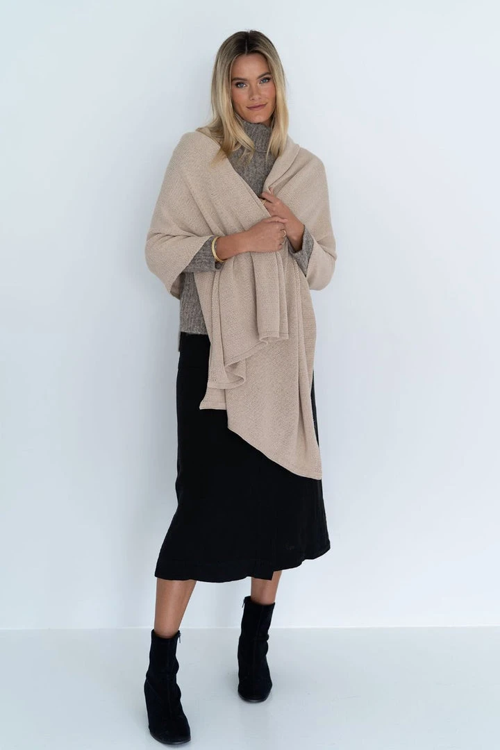 Basically, a wearable blanket… Take the comfort of your home and wear it as a stylish accessory. The natural cotton/linen fibre has been knitted into a delicate braided pattern allowing your skin to breathe whilst staying cosy during the cooler months