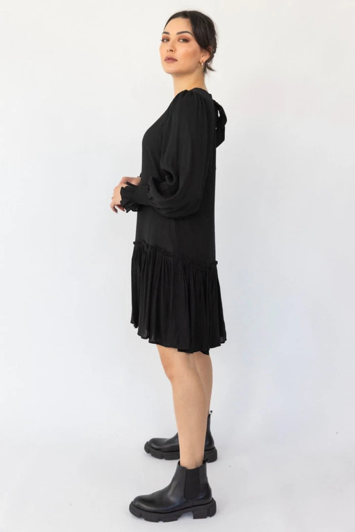 Have a feminine chic moment in our Bria dress from Ivy + Jack! This pretty mini features a high neckline, cuffed long sleeves and a dropped waist with frill detailing. It’s the perfect piece for those upcoming day events or can be paired with boots and a blazer for an evening look.