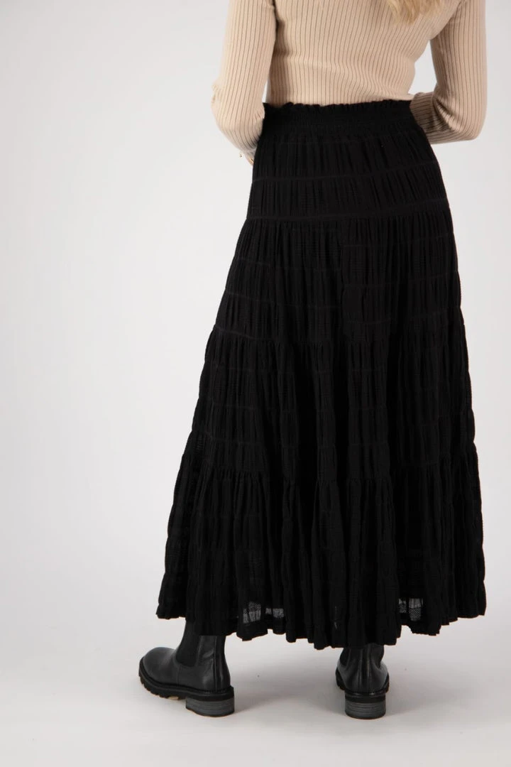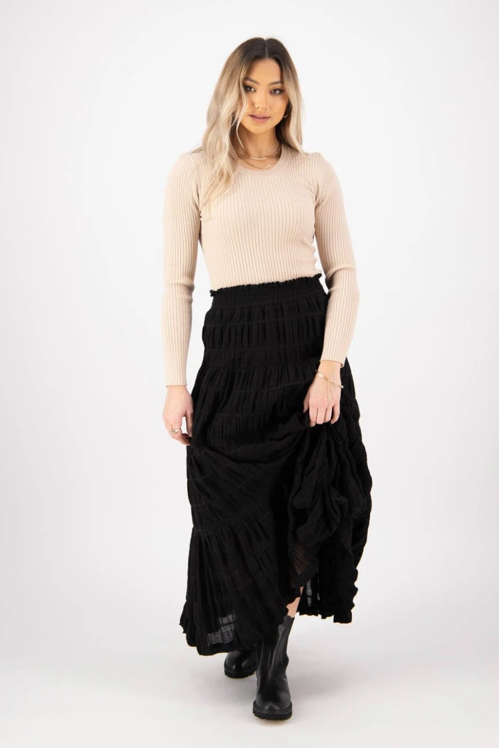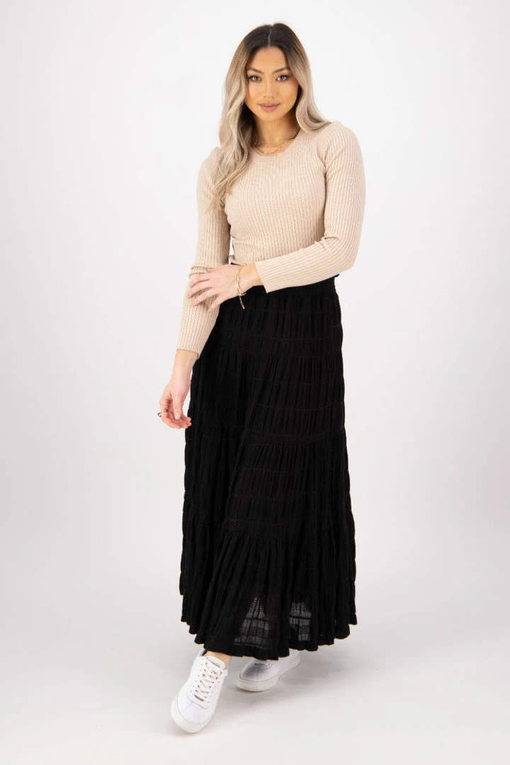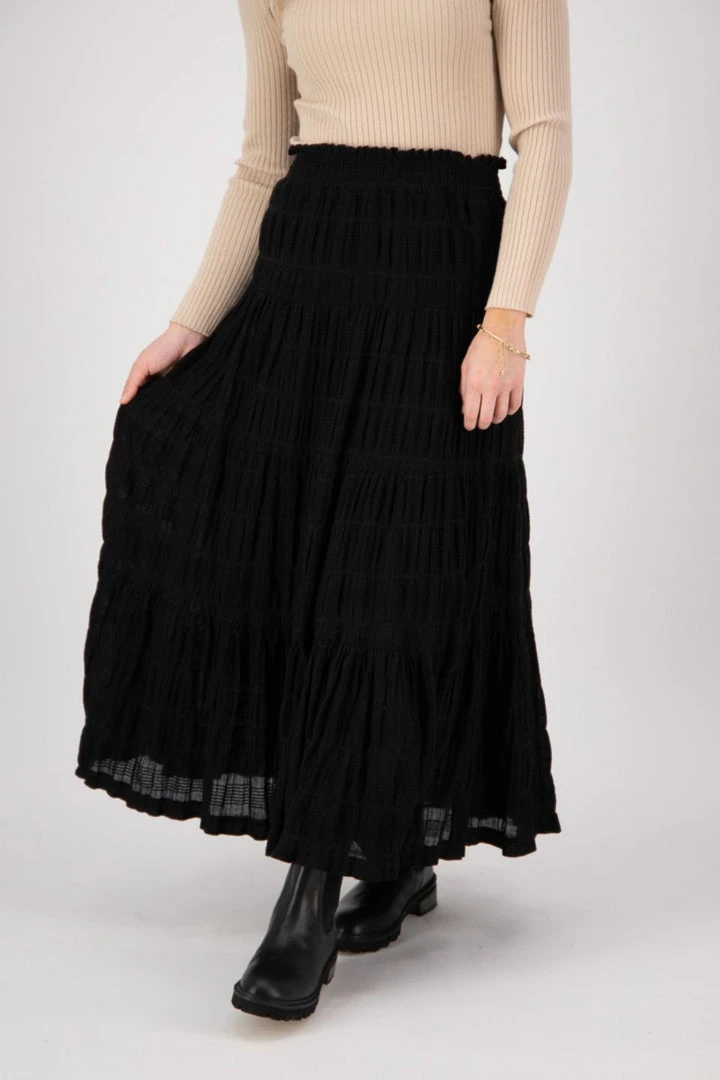 The Charming black tiered maxi skirt is a must-have staple in your wardrobe! This skirt looks great with a tee-shirt and trainers in the summer.Â