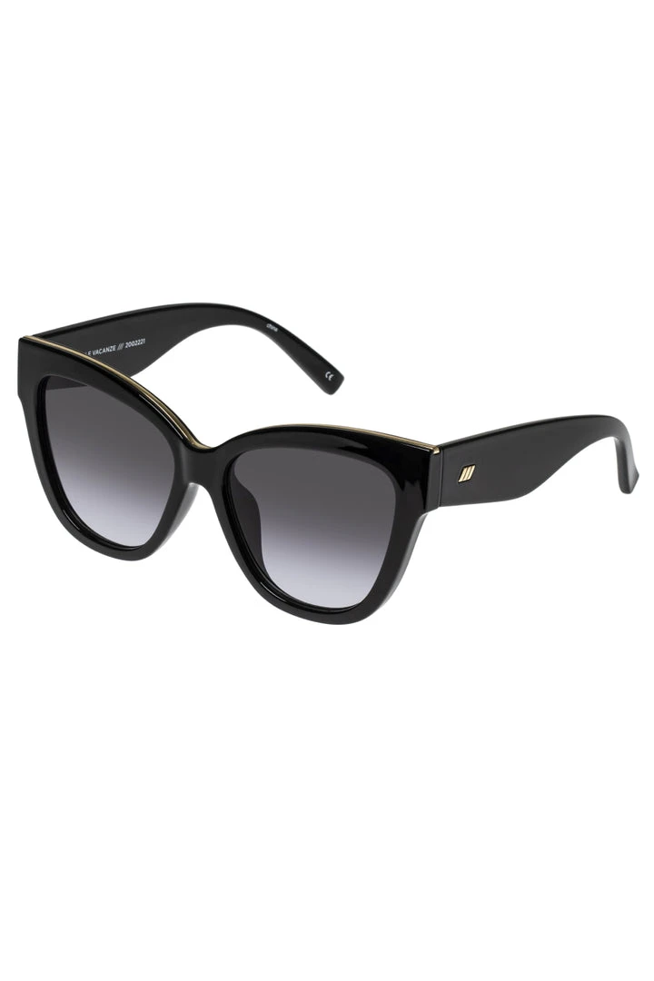With feminine angles and oversized proportions, Le Vacanze in black is the pair of sunglass that you just won’t want to take off. This thick-framed women’s cat eye style features luxurious metal top bar inlay detailing, and iconic Le Specs flagstripe metal hardware.