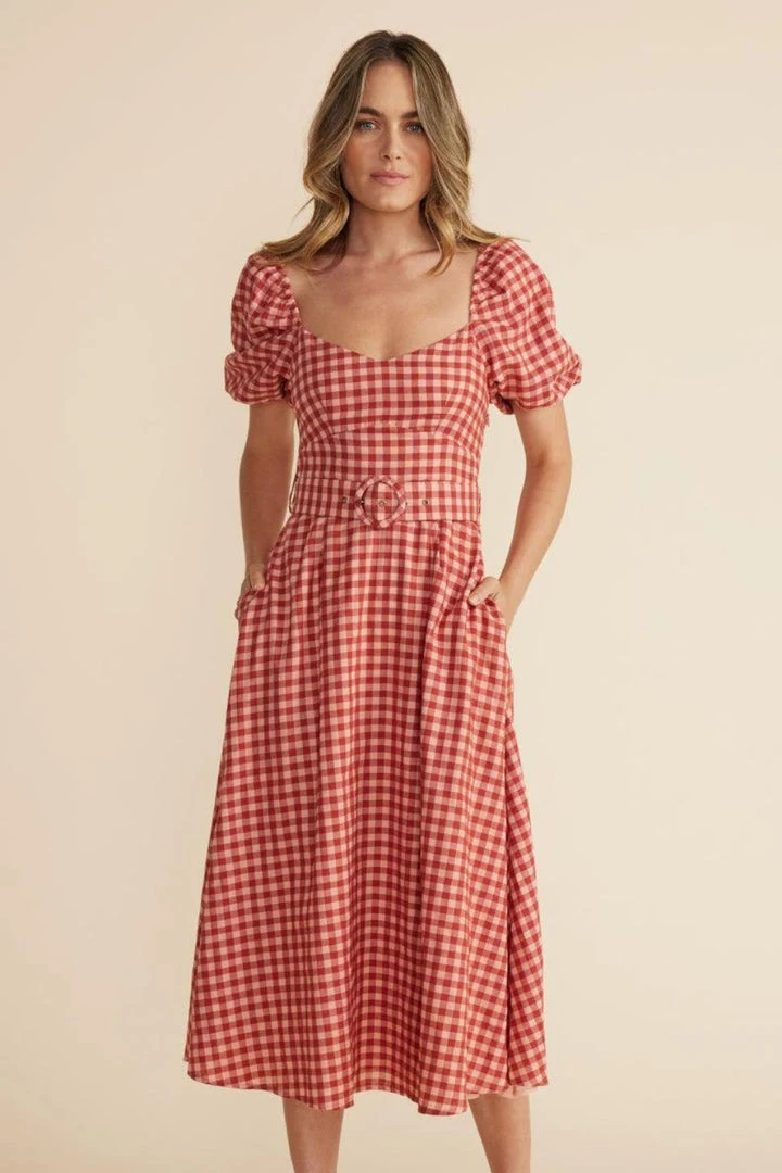 Featuring a sweetheart neckline, flared skirt and elasticated puff sleeves in a stunning gingham print, the Cora Midi Dress is a dream come true for your next outdoor event.
