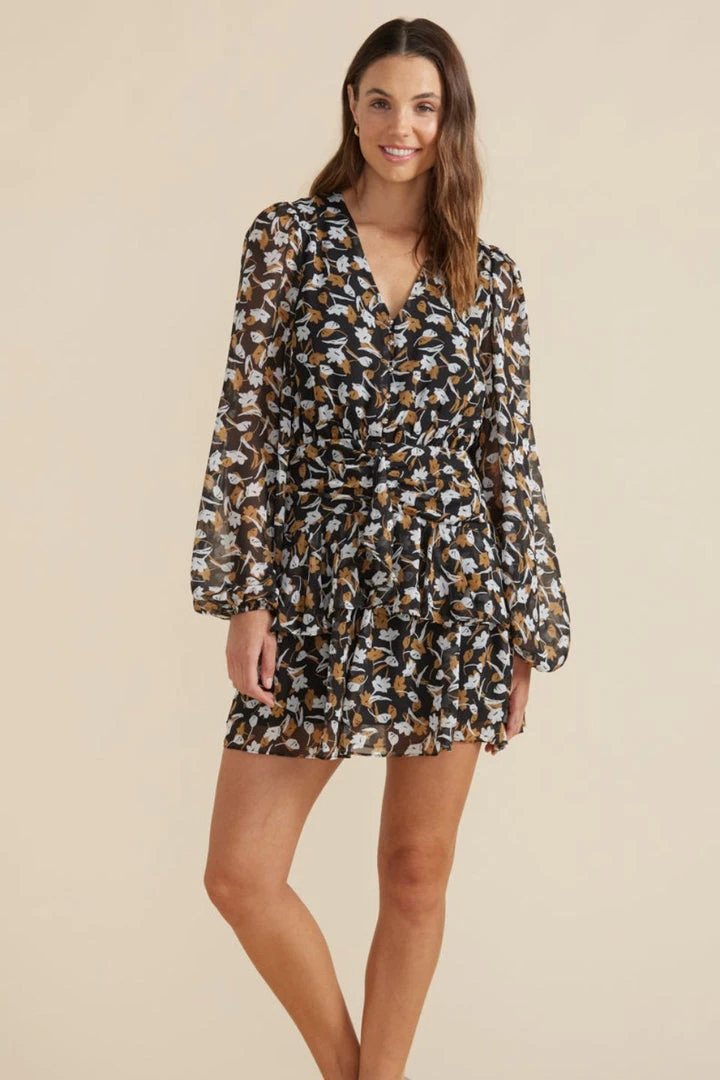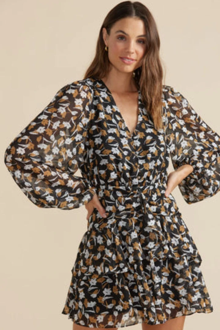 The Elena Mini Dress is the perfect dress to take you from day to night. Featuring a flattering V-neckline with buttons, a ruffled skirt and full length sheer sleeves. Wear with boots for a seasonal update.