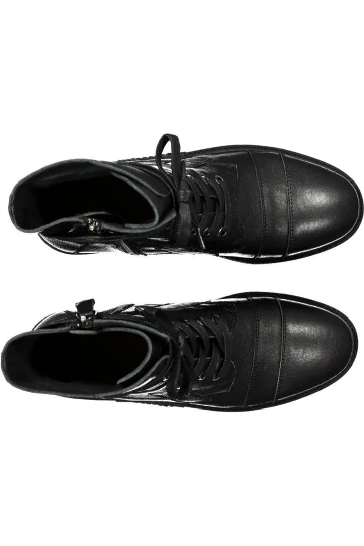 Patch Me is an edgy lace-up boot crafted out of soft milled leather. Features include adjustable extra-long laces that tie and wrap around the ankle, a back loop for the exaggerated laces to loop through, an inner zip to take the boots on and off with ease, stitching detail around the toe cap, stitched ‘patch’ details in various places on the boot and a rubber sole.