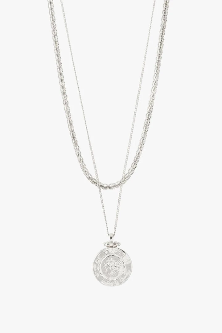 Pilgrim Nomad Double Chain Coin Pendant Necklace Silver