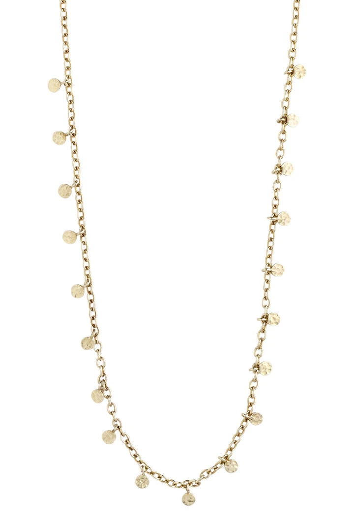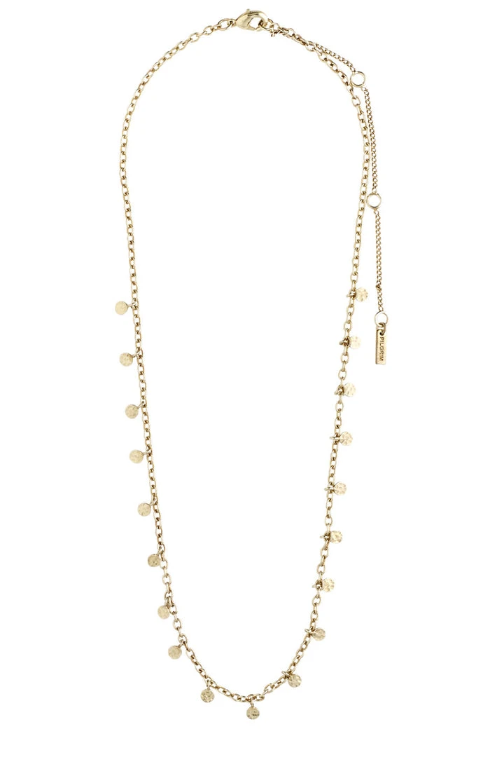Feminine silver-plated necklace with small round polished pendants along the chain. The delicate necklace is 40 cm long with a 9 cm extension chain. The design was inspired by classic exotic jewellery, and the necklace is the perfect contrast to an edgy outfit. Let your femininity shine through with this charming classic.