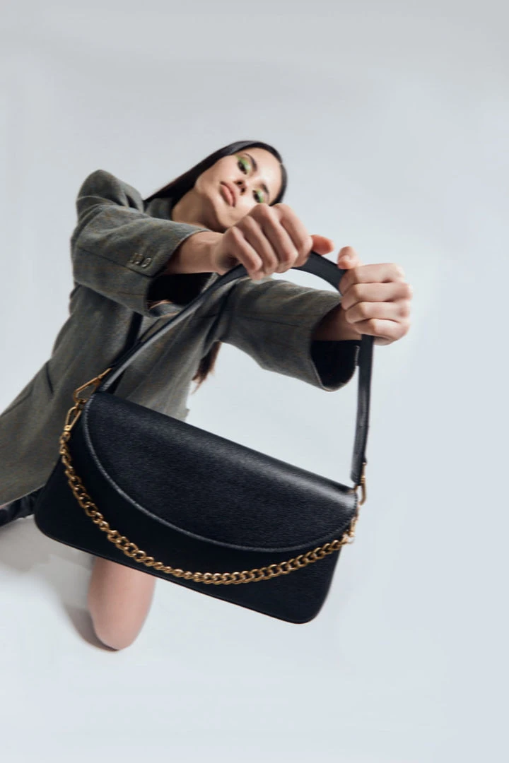 The wide shoulder strap and detachable brass-finish chain provide you with multiple options to compliment all of your stylishÂ