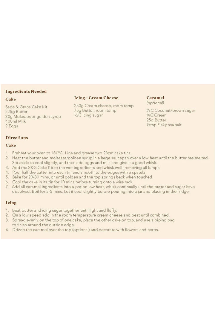 This Spiced Gingerbread Cake Kit is the cake that started Sage and Grace. It has been a crowd favourite since well before the beginning and is the perfect cake for a cool evening with salted caramel drizzled all over it. Serves 14 – as a double layer cake, or bake into mini cakes/muffins and freeze to enjoy later. Adjust baking time slightly. Made with Gluten Free Flours. All you need to add is milk, butter, eggs and molasses/golden syrup.
