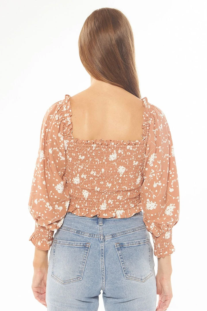 Look absolutely heavenly in our Angelic Toffee Bloom Top! This gorgeous piece featuring a stretchy shirred bodice and long puff sleeves is perfect to wear across seasons and can easily be dressed up or down for any occasion. Wear it to dinner with trousers, heeled sandals and a baguette bag for a chic look!