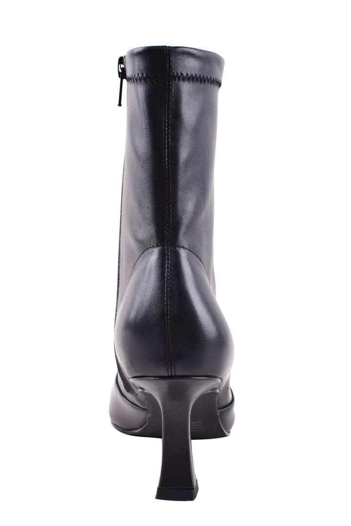 The sock boot trend is elevated through the use of butter-soft black leather. Featuring a snug fit from just above the ankle, the Aria boot is finished with leather inset detailing around the heel and toe and an angled fluted heel.