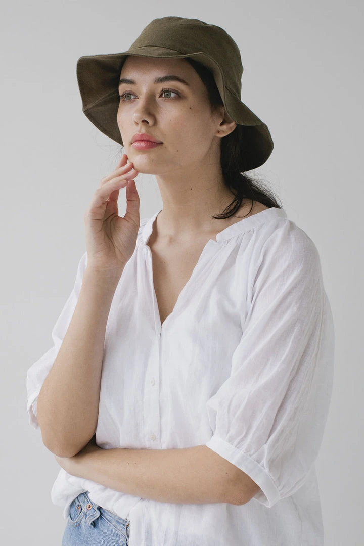 Simple linen bucket hat. Looks good & sun-safe too.Â