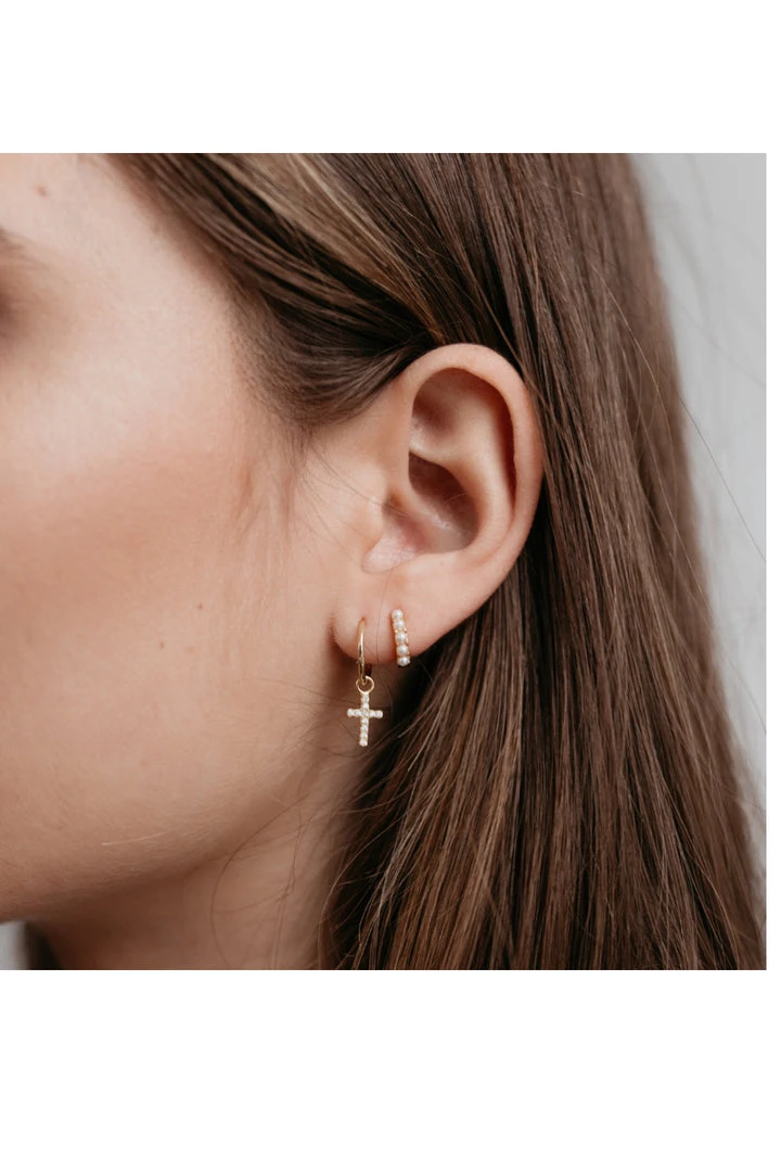 Delicate little huggies, made up of mini pearls. Super sweet on their own, even better layered with other earrings.