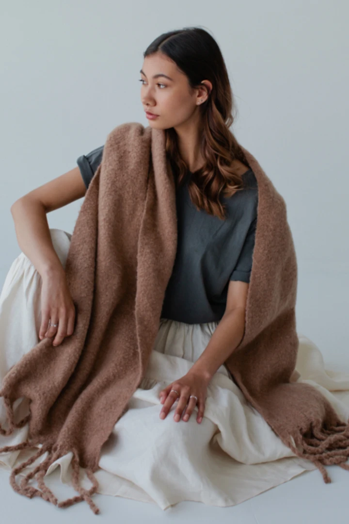 The softest scarf you’ll own. Blanket style scarf with a statement fringe in a classic earthy hue.