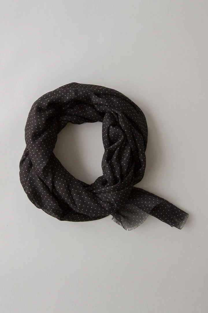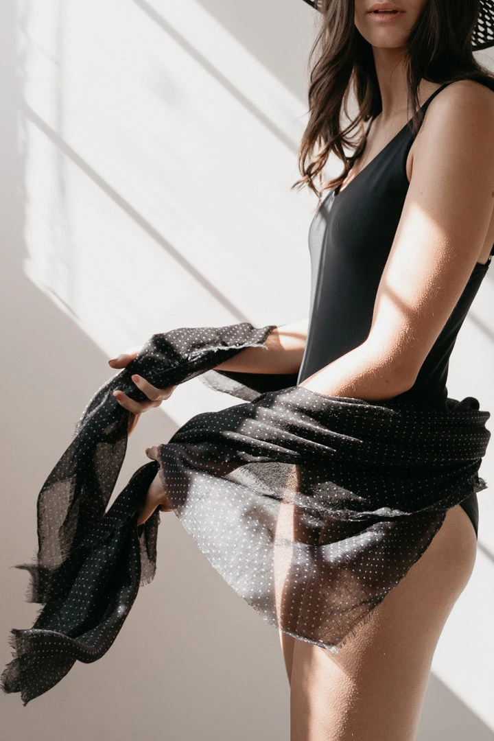 We are totally obsessed with spots! This classic lightweight black scarf with sand spots is perfect for all year round. Works with all your basic cottons and is handy as a wrap at the beach with your bikini or for a little bit of shade. Finished with a fringed edge; you’ll always keep this one handy in your bag if it’s not on your neck.