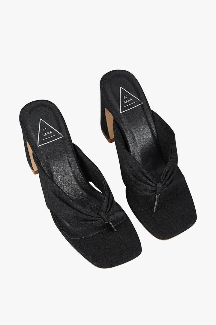 Meet Freya, she„¢s elegant, recyclable and finished with 100% organic linen. Featuring an exaggerated flute heel and of the moment black ruched strap that extends between the toes, there„¢s no better way to go from day to night.