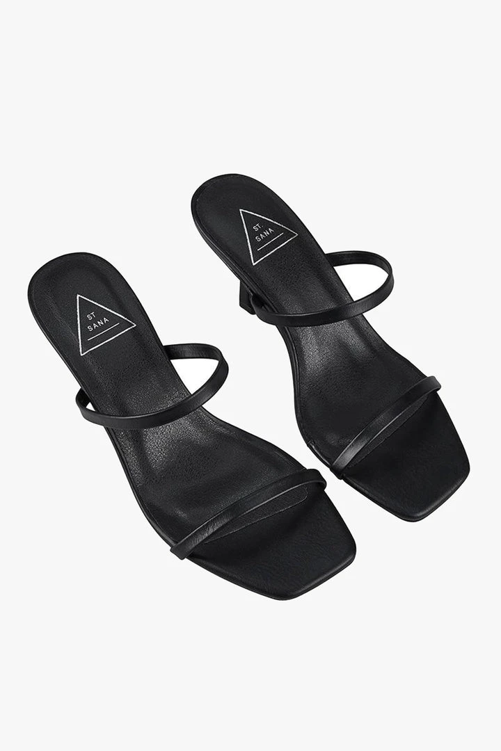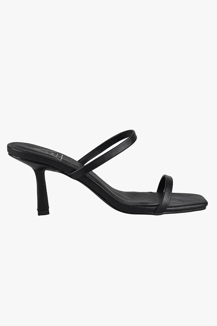 The Jamie mule is the ultimate finish to an evening look. Barely there black straps wrap the foot while a fluted heel and square toe lend a heavy dose of attitude.