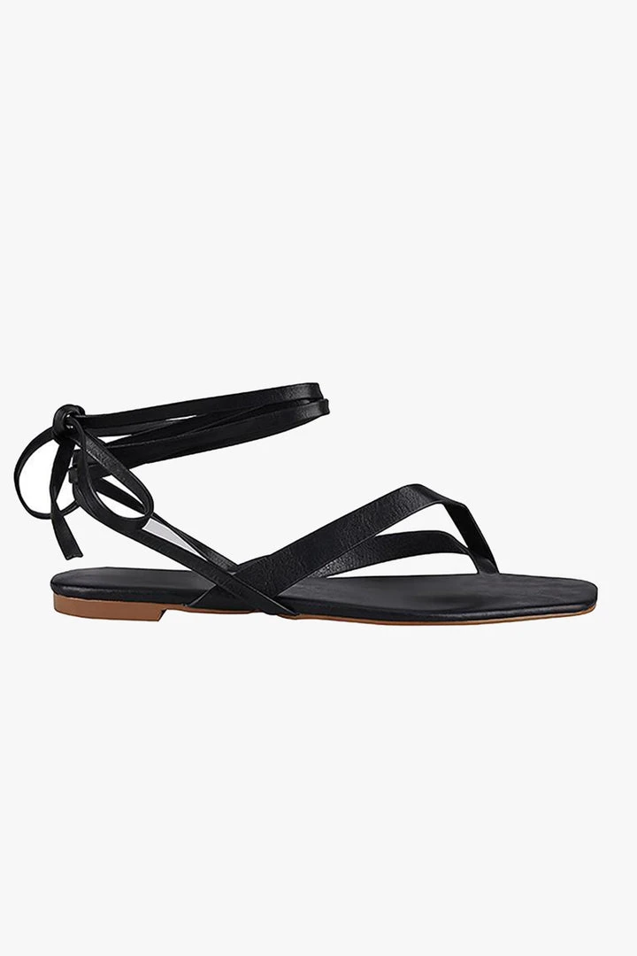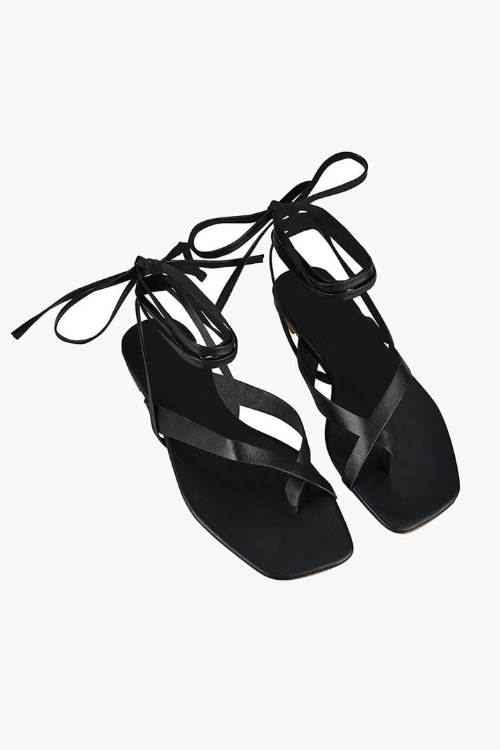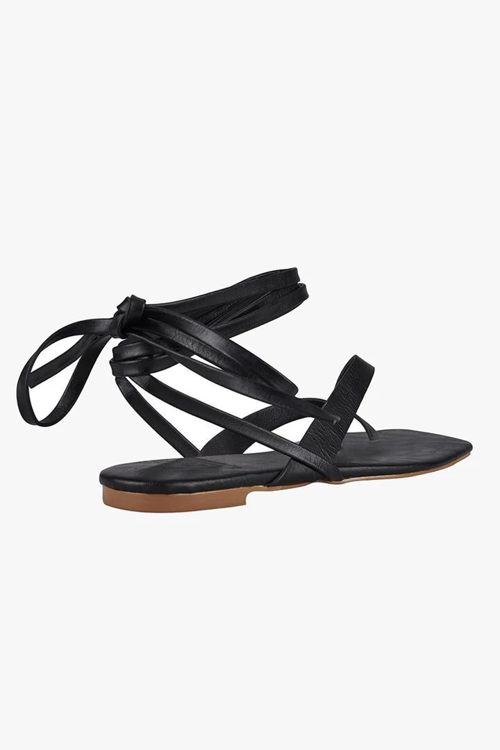 The Stormy sandal is all straps, all day. Two black straps wrap the foot before extending upwards to secure the ankle and finish with a bow !