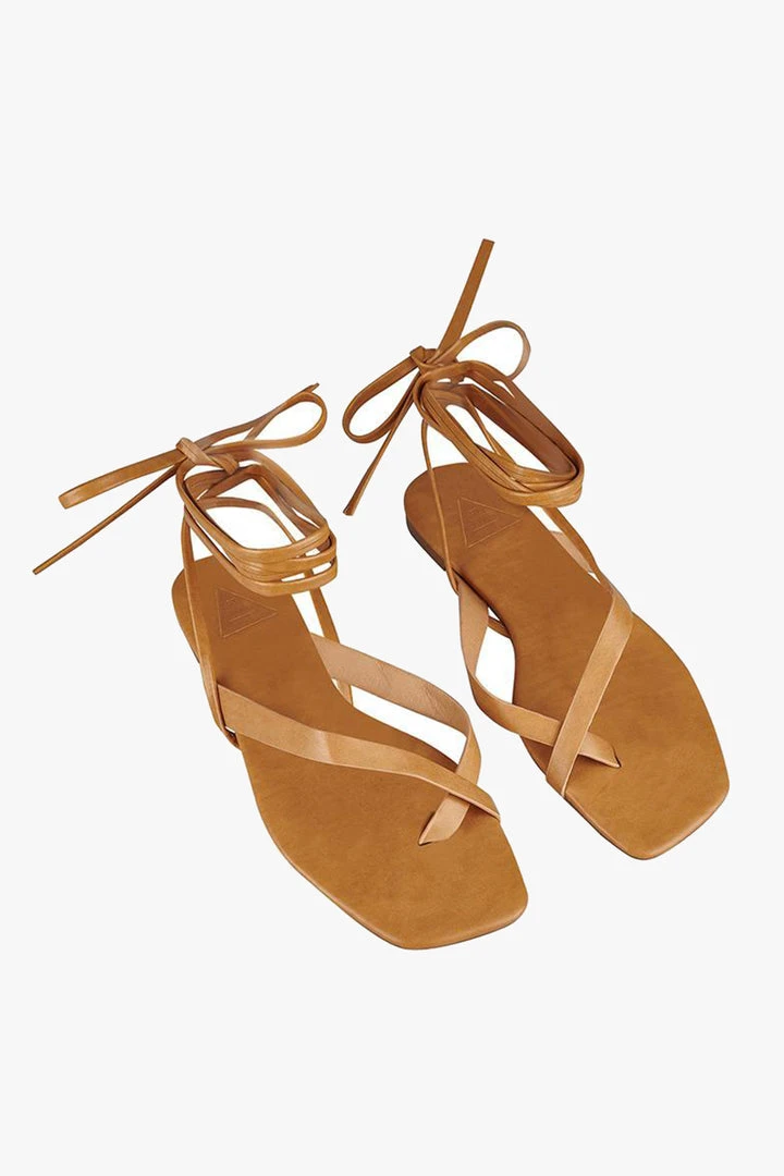 The Stormy sandal is all straps, all day. Two tan straps wrap the foot before extending upwards to secure the ankle and finish with a bow!