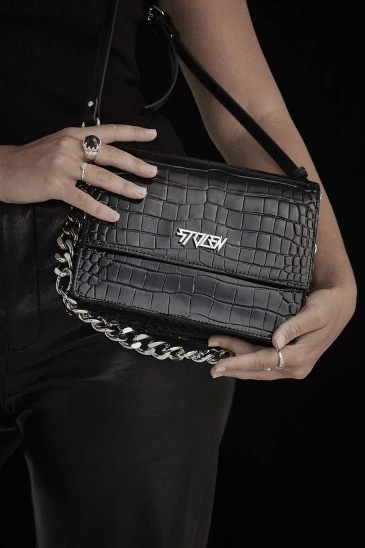 Designed with sharp corners, cleaner lines, and angular features, this style has more structure and feels almost architectural. Beautifully crafted in rich crocodile-effect texture, this has a modernized high-sheen leather and chunky silver hardware.