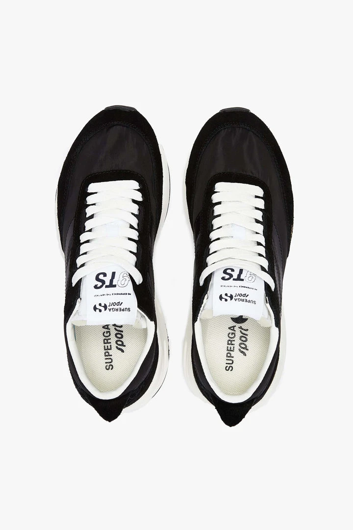 Our updated and improved slim 9TS is made from 100% Recycled nylon from PET and suede leather. The tongue shows an unlined sponge padding, a classic detail of the 90s retro-running heritage sneaker. Featuring our heritage sports patch logo on the tongue, 9TS gold foil branding on the outer and ”Superga Sport” on the sole. The midsole is made from EVA and outsole in rubber.